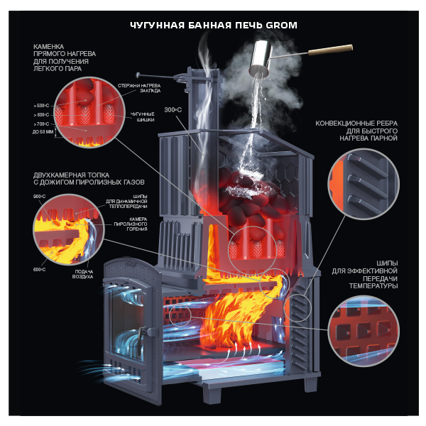 Увеличенная масса, толщина боковых стенок 14 мм повышают надежность и теплоаккумулирующую способность, а для быстрого нагрева парной боковые стенки оборудованы конвекционными ребрами не только снаружи, но и на внутренней поверхности.